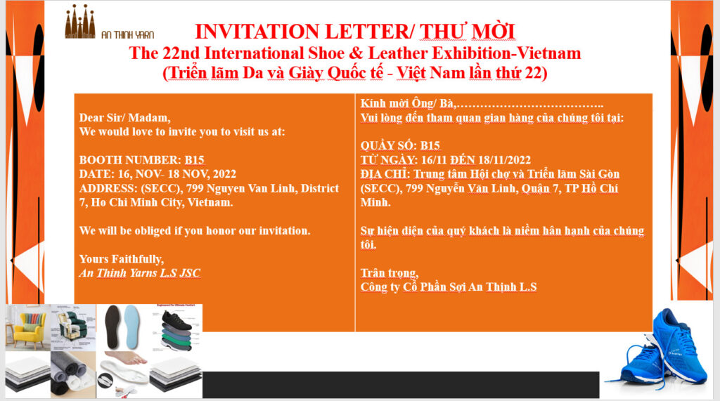Từ ngày 16/11/2022 đến ngày 18/11/2022, Công ty Cổ Phần Sợi An Thịnh L.S là một trong số những doanh nghiệp tiêu biểu đến từ Việt Nam tham gia Triển lãm Da và Giày Quốc tế – Việt Nam lần thứ 22. Đây là dịp để Sợi An Thịnh L.S giới thiệu những sản phẩm chất lượng, tiêu biểu đến các đối tác, khách hàng trong và ngoài nước. Kính mời Quý khách hàng, đối tác ghé thăm gian hàng tại gian B15 – Sảnh Chính A – Triển lãm Sài Gòn – SECC.